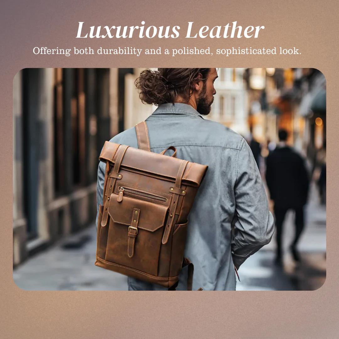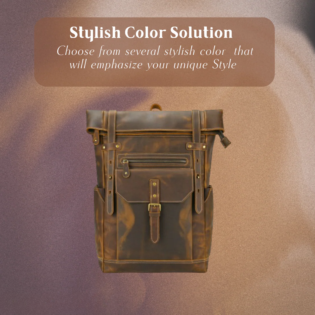 This vintage leather roll-top backpack is built for both style and practicality. Made from high-quality leather, it offers a timeless, rugged look. Perfect for everyday use or travel, it combines strength with sleek aesthetics.